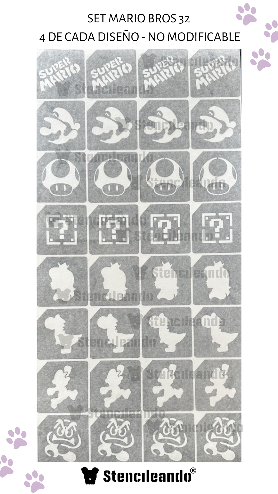 Cada set trae 32 unidades de 7x7cm, 4 stencils de cada diseño.
